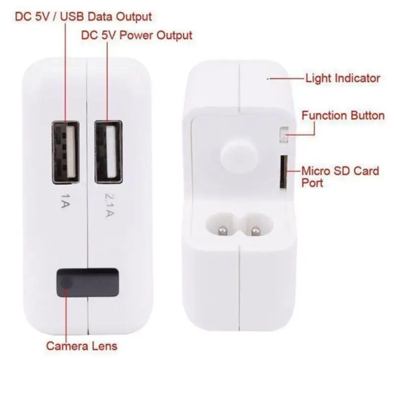 functioning as a high quality USB wall charger;High quality camera with full HD audio & video recording;Motion detection recording; U.S/EU Wall Charger; Invisible covert micro lens;Can be used as a full HD web cam;Long operation time;